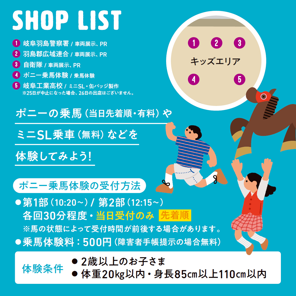 岐阜工業高校による無料のミニSL乗車体験・缶バッジ作りや自衛隊・消防・警察車両展示、ワークショップ(ジャパンポリマーク株式会社)などがお楽しみいただけます!