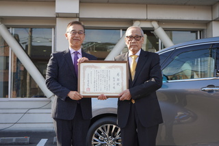 令和7年11月27日(木曜日)、笠松町在住の松原守様より、将来にわたり町民の皆様が安全、安心して暮らしていけることを願い、環境に配慮した電気自動車、災害時やイベントなどに活用するインバーター発電機15台、ポータブルバッテリー6台を寄贈いただきましたので、寄贈式を開催し、町から感謝状を贈呈しました。有効に活用いたします。誠にありがとうございました。